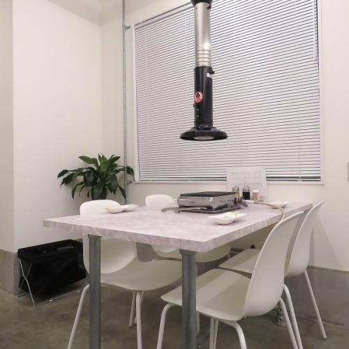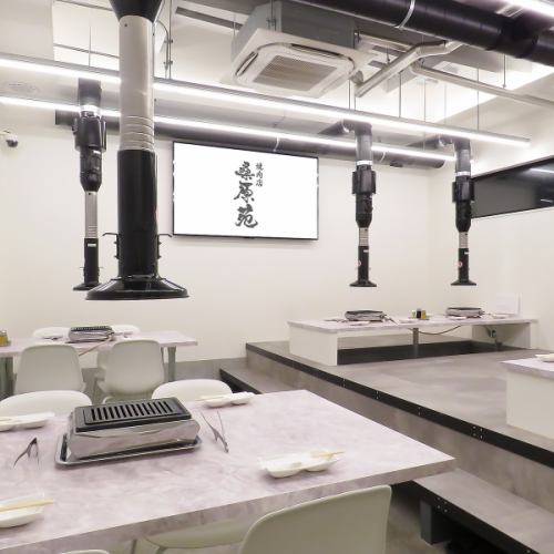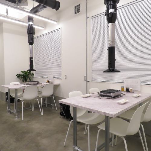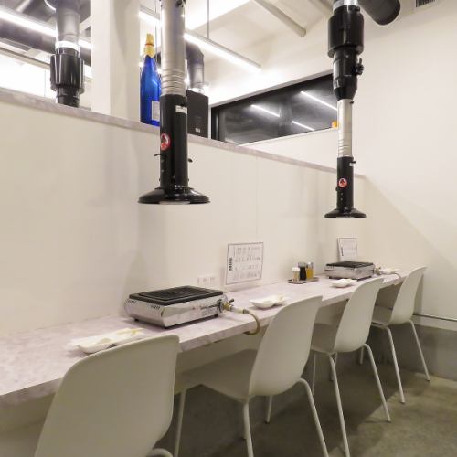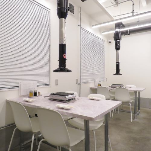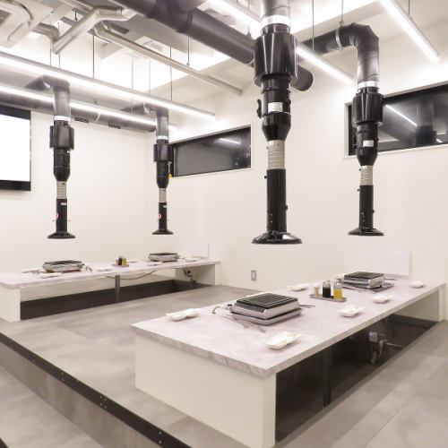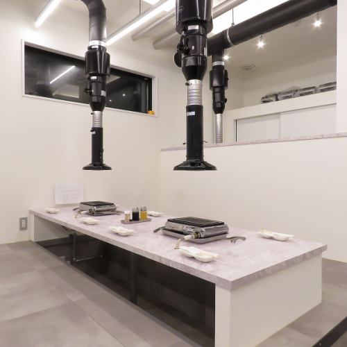 店内は、モダンでミニマルなデザインが印象的なテーブル席です。座って楽しめるスタイルのお席には、各席に専用のグリルが設置されており、目の前で焼きながら食事を楽しめるスタイルです。頭上には大型の排気フードが備えられており、煙や匂いを気にせず快適に過ごせる空間です。